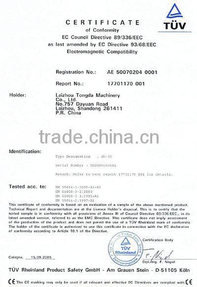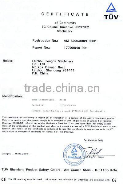 Наша компания обладает наиболее современным оборудованием и испытательными приборами. У нас сильные инженерные возможности и современная административная система. На данный момент компания получила сертификацию системы управления качеством ISO9001:2000. Наши ведущие продукты, такие как станки для резки, бетономешалки и лесопильные ленточные пилы, получили сертификацию CE от службы сертификации продукции TUV Германии.